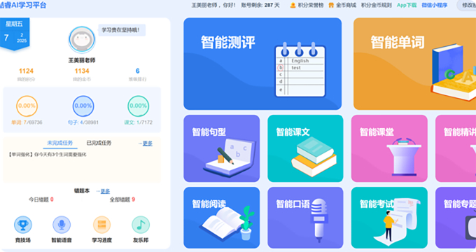 整个系统共有 16个模块组成,同时具备学习英语的两大优势: 训练类(以练为主,系统植入记忆算法模型,往复循环不会的单词、词组、句子以及课文, 注重学生的参与感,学生全程参与听、说、读、写、速记,从而快速提升英语水平)和学习类 (以视频学习为主,同步知识点的视频学习