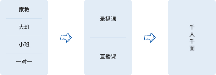 一对一形式发展到通过电视电脑的录播课、直播课模式,进而发展到“千人千面”的个性化学习系统。